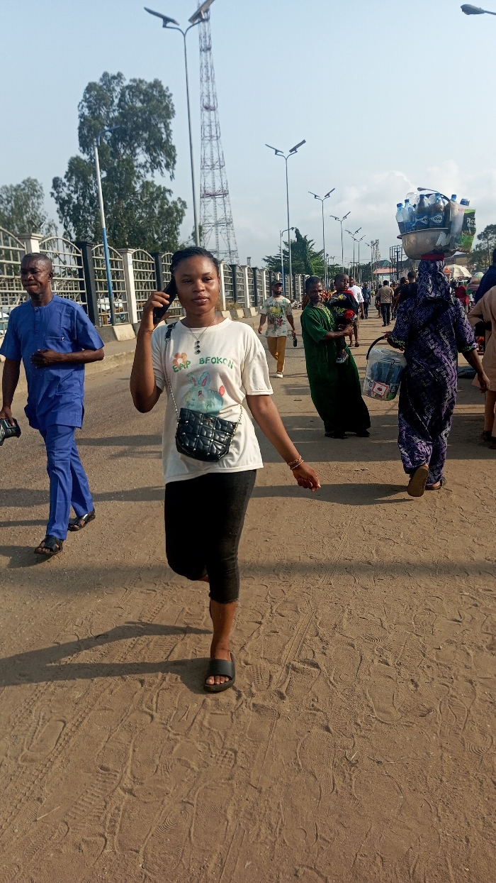 The image depicts an outdoor, daytime pedestrian scene on a reddish-brown dirt path in the city of Unknown, Unknown. Bright sunlight illuminates the scene, casting shadows primarily towards the right. In the immediate foreground, a young adult female with dark skin walks forward, holding a dark smartphone to her left ear, appearing to be on a call. She wears a light-colored, short-sleeved t-shirt with a graphic design, a dark studded crossbody bag, dark capri-length leggings, and black slide sandals. A light-colored bracelet is visible on her right wrist. To her left, a man with dark skin walks from left to right, wearing a blue short-sleeved tunic and matching pants, along with dark sandals. He holds a dark, possibly rectangular object in his left hand. Behind him, a grey metal fence with horizontal bars separates the dirt path from what appears to be a paved road or elevated structure. Green trees are visible beyond the fence. In the midground and background, multiple pedestrians are present. To the right of the main subject, a woman in a dark purple patterned full-body garment walks away from the camera, balancing a large metal basin filled with numerous plastic water bottles and other packaged goods on her head. She also carries a clear plastic bucket containing items in her left hand. Next to her, a woman in a dark green garment carries a small child wrapped in fabric on her left hip. Other indistinct figures are visible further down the path in the distance. The background features numerous streetlights equipped with solar panels, lining what appears to be a road extending into the distance. A tall, grey metal lattice communication tower stands prominently in the upper left background against a clear, light blue sky with minimal cloud cover. The ground exhibits various footprints and tire tracks.