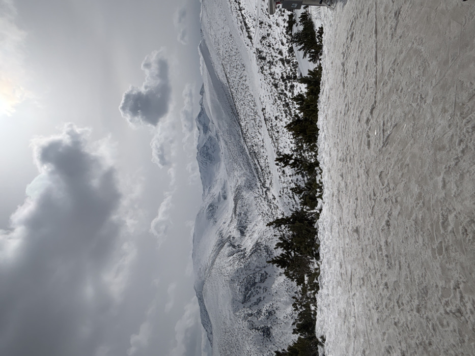 The image displays a wide-angle, panoramic view of a snow-covered mountainous landscape, identified as being in the vicinity of Samokov, Bulgaria. The immediate foreground consists of a textured, packed layer of snow with visible indentations. A horizontal band of dark green, coniferous trees and shrubs separates the foreground from the midground. Beyond this vegetation, successive layers of snow-covered slopes and peaks extend into the distance, characterized by undulating terrain and scattered evergreen patches. The background is dominated by additional snow-capped mountains. The sky is partially overcast with a mix of dark and light grey clouds, and a bright area in the upper right suggests the position of the sun. On the far right edge of the foreground, a partial view of a grey, metallic structure, consistent with a coin-operated telescope, is visible. No individuals or active elements are present in the scene. The overall environment is a winter alpine setting.