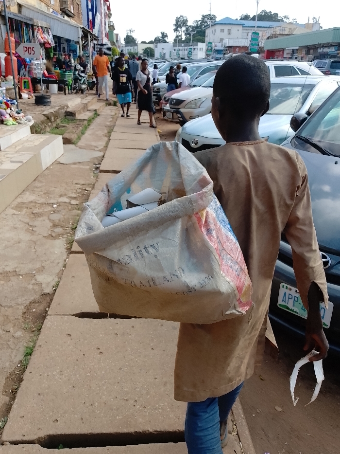 The image depicts a street scene in Jos, Nigeria. A young individual, viewed from the rear, walks leftward on a cracked concrete sidewalk. The person wears a tan long-sleeved tunic over blue trousers and carries a large, off-white woven polypropylene sack over their right shoulder. The sack contains multiple rolled white cylindrical items and displays partially visible text including "Quality" and "ATLANLA." The individual's right hand holds a small, torn piece of white material. To the immediate right of the individual, a black vehicle with a partial Nigerian license plate "APP-40" is parked, part of a row of vehicles lining the street. On the left side of the sidewalk, several pedestrians are visible, including a man in an orange shirt and two women in dark attire, walking away from the viewer. A row of commercial storefronts lines the left side of the street, displaying various merchandise, including colorful items. One storefront features a "POS" sign with an arrow. A motorcycle is parked near the storefronts. The background includes distant buildings, green trees, and a light, hazy sky.
