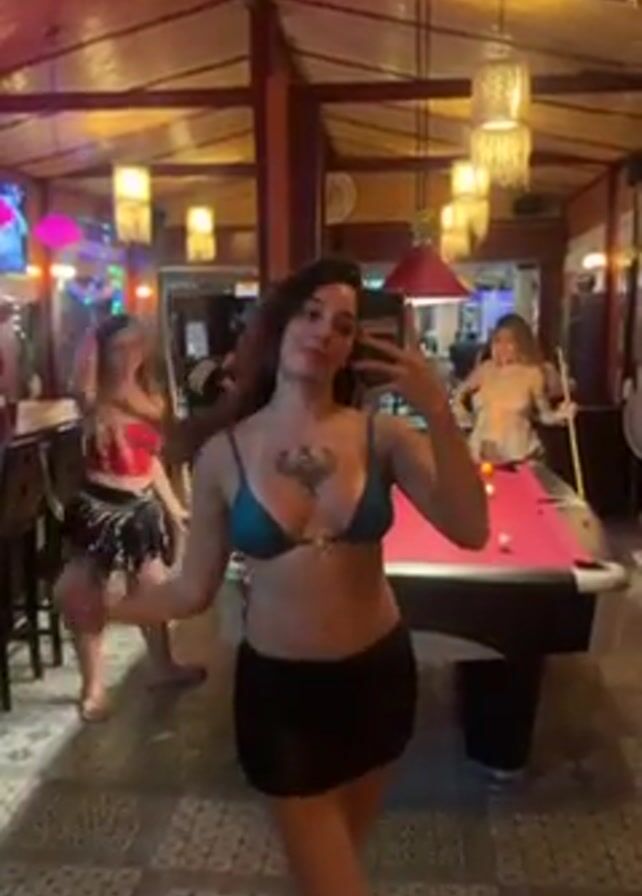 A young woman films herself in a selfie in a bar or pool hall, reflected in a mirrored wall. She wears a teal bikini top, a short black crocheted skirt, and light-colored sandals. A gold necklace with an Egyptian style pendant adorns her chest and she has a tattoo above her breasts. Two other women are visible in the background. One wears a red crop top and dark patterned skirt, while the other plays pool, wearing a light-colored top. The pool table is pink. The bar’s interior is decorated with hanging lights, colorful decorations, and tiled floors. The woman in the foreground initially poses and then smiles widely, sticking out her tongue and raising her arm in a celebratory gesture.