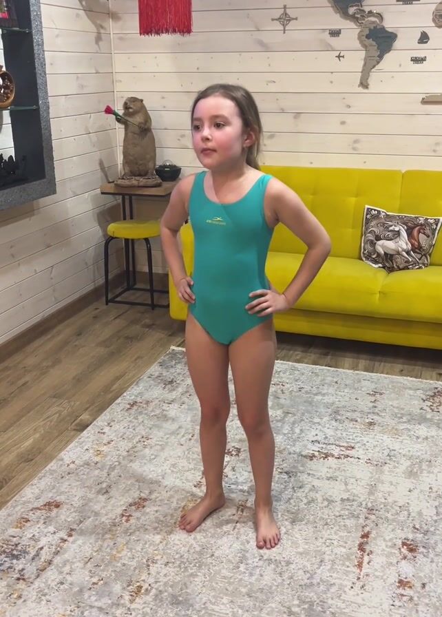 A young girl stands indoors on a light-colored rug in a green swimsuit, hands on her hips