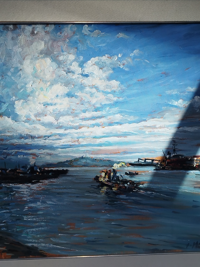 An impressionistic oil painting displays a harbor scene under a bright, cloudy sky