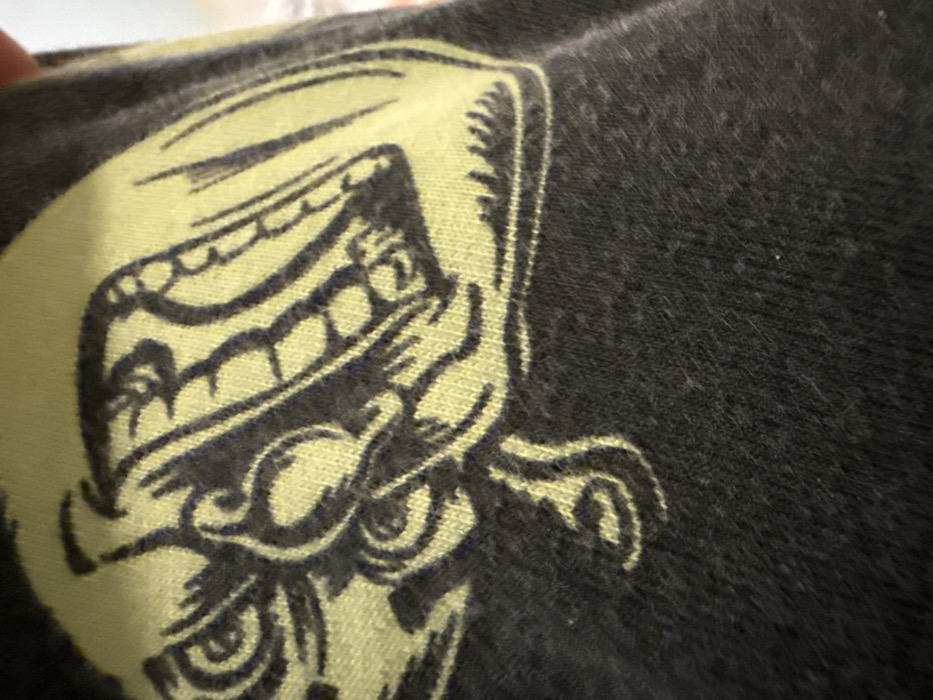 The image presents a close-up, angled view of a dark gray or black textile surface, likely a garment, exhibiting minor pilling consistent with fabric wear. A large, stylized graphic design is screen-printed onto the fabric in a vibrant, light yellow-green color. The design depicts a creature's head, rendered with tribal or reptilian characteristics, featuring an open mouth with visible teeth along the upper and lower jaw, and an eye with intricate surrounding patterns. Swirling and angular motifs extend from the main head structure, suggesting a complex artistic representation. No environmental context, location, or human presence is discernible within the frame. No identifiable landmarks or features of Varna, Bulgaria, are visible in the image.