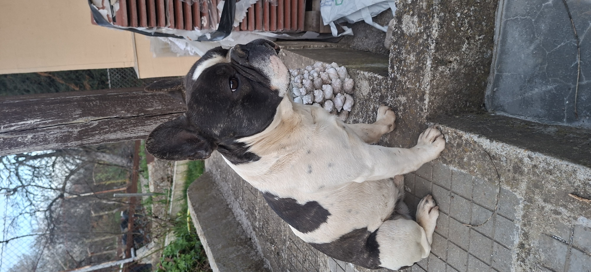 A medium shot depicts a bulldog lying on a concrete step. The bulldog is predominantly white with black markings around its head and patches on its body. It is positioned near a collection of shells on the step. The setting appears to be outdoors, with hints of vegetation and a fence visible in the background. The location is Balinovtsi, Bulgaria.