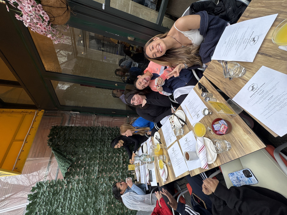 The image captures an outdoor dining scene at "Barking Dog Hell's Kitchen," located in the Hell's Kitchen neighborhood of Manhattan, New York City, United States of America. Eight individuals are visible, primarily women, seated at two wooden rectangular tables positioned on a patio area. An orange awning extends overhead, partially covering the space. A green artificial foliage wall serves as a partition on the left, behind which a brick building is discernible through a transparent plastic sheet. On the right, large glass doors with dark frames separate the patio from the interior of the restaurant, reflecting additional patrons inside. A hanging basket containing pink artificial flowers is attached to the building structure near the glass doors. On the left side of the tables, a woman in a light blue jacket sips from a white mug. Adjacent to her, a woman in a black long-sleeved top and a black headband observes to her left, while another woman in a blue long-sleeved top looks towards the center-right. A person in a red jacket is partially visible at the far left edge of the frame. On the right side of the tables, three women are posing for the camera: one in a black long-sleeved top and a black headband makes a "kiss" face, a woman in a peach and white striped jacket laughs openly while holding a white cup, and the woman closest to the camera, with long light-brown hair and wearing a white lace camisole and dark blue cardigan, smiles and displays a peace sign. In the immediate foreground, a person's arm wearing a dark top with white stripes is visible, holding a smartphone with a blue and white patterned case. The tables are set with white paper menus displaying the "Barking Dog Hell's Kitchen" logo, multiple glasses containing orange liquid (likely orange juice or mimosas), white ceramic mugs, water glasses, silverware, and white napkins with red stripes. Additional objects on the tables include small pitchers, salt and pepper shakers, a red bowl filled with sugar packets, a clear glass bottle, and a small yellow table stand.