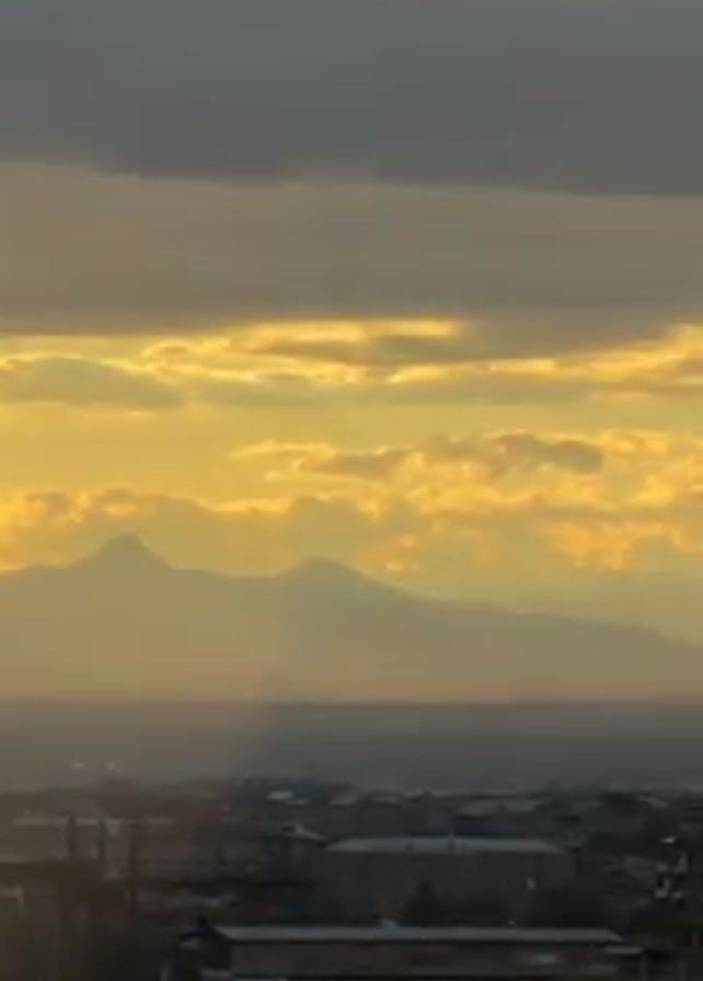 cityscape in the foreground and a mountain range in the background under a sky filled with clouds, some illuminated by a golden light. The clouds in the upper portion of the frame are dark, suggesting an overcast sky. The mountains are silhouetted against the bright sky, appearing hazy and distant. Below the mountains, the cityscape consists of buildings and structures. Power lines are visible in the lower left corner of the frame.
