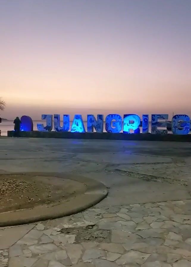 large sign that says "JUAN GRIEGO" changing colors against the backdrop of a dusky, purple-tinged sky. The sign is positioned in front of what appears to be a body of water. The ground in the foreground is paved with a random pattern of stones. A round concrete circle is visible to the left. A tree can be seen to the right of the sign. The video appears to have been shot at dusk.