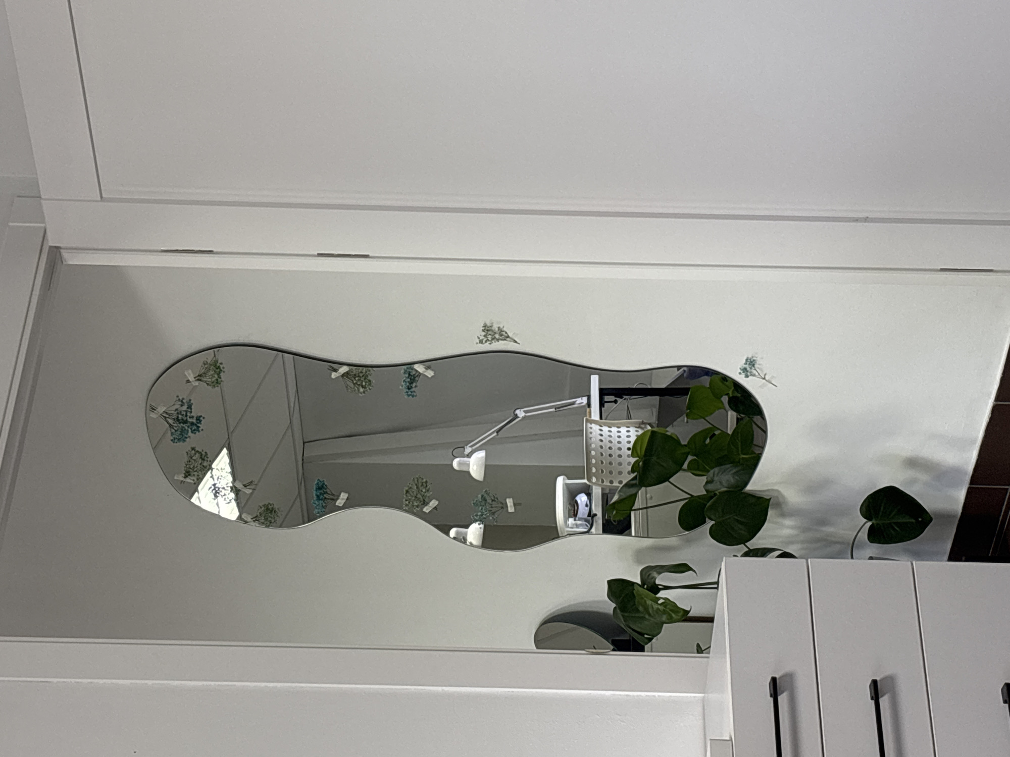 The image depicts an interior scene within a building in Chaikovsky, Russia. A large, irregularly shaped wall mirror is centrally mounted on a white wall. The mirror reflects a section of an adjacent room, revealing a white desk, a white perforated office chair, two white adjustable-arm desk lamps, and a white cylindrical basket. Overhead, a suspended ceiling with fluorescent lighting fixtures is visible in the reflection, along with a white curtain or partition. Several small bunches of dried flowers, colored blue and light green, are taped to the wall, visible both directly and through the mirror's reflection. In the lower left foreground, a partial view of a white dresser with three drawers and black horizontal handles is present. A large green houseplant with broad leaves stands in the lower foreground, partially obscuring the mirror. The surrounding walls are white, with a dark brown baseboard at the bottom. A white door frame with a closed white door is visible on the right side of the image.