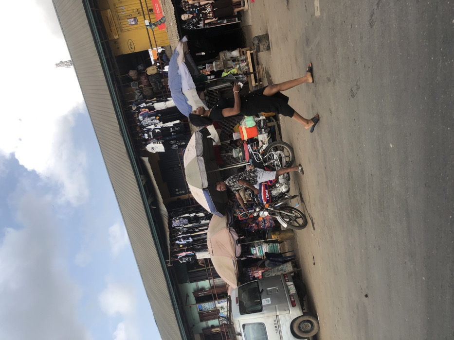The image depicts a busy street scene in Ogbaku, Nigeria, under a partly cloudy sky