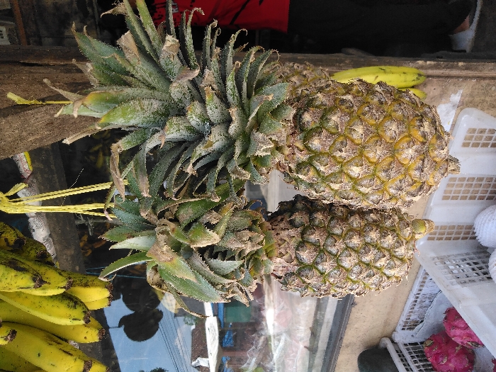 This image captures a detail view of a fruit stall located in Ban Lao Ta, Laos. In the foreground, two ripe pineapples hang vertically from distinct strands of yellow string, which are secured to a sturdy, light-brown wooden post or beam on the right side of the frame. Each pineapple exhibits a greenish-yellow body with distinct segmented skin patterns and is topped with a spiky, deep green crown. Above the pineapples, a cluster of yellow bananas hangs. Below the hanging fruits, multiple white plastic crates are visible, containing other produce. The leftmost crate holds several bright pink dragon fruits and a dark green, oval-shaped fruit. Another crate contains several round fruits individually wrapped in white protective mesh. The background features a large glass panel, reflecting blurred outdoor elements such as what appears to be part of a building and sky. On the far right, partially obscured by the wooden beam, a person wearing a red shirt and dark trousers is visible.