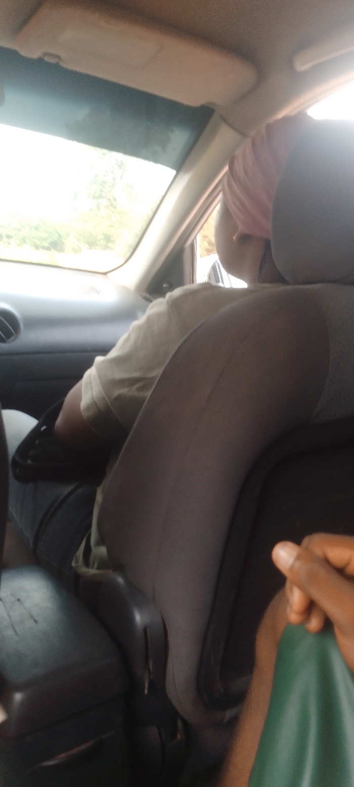 The image provides a view from the rear passenger seat of a vehicle in Ogbogbo, Nigeria, looking forward