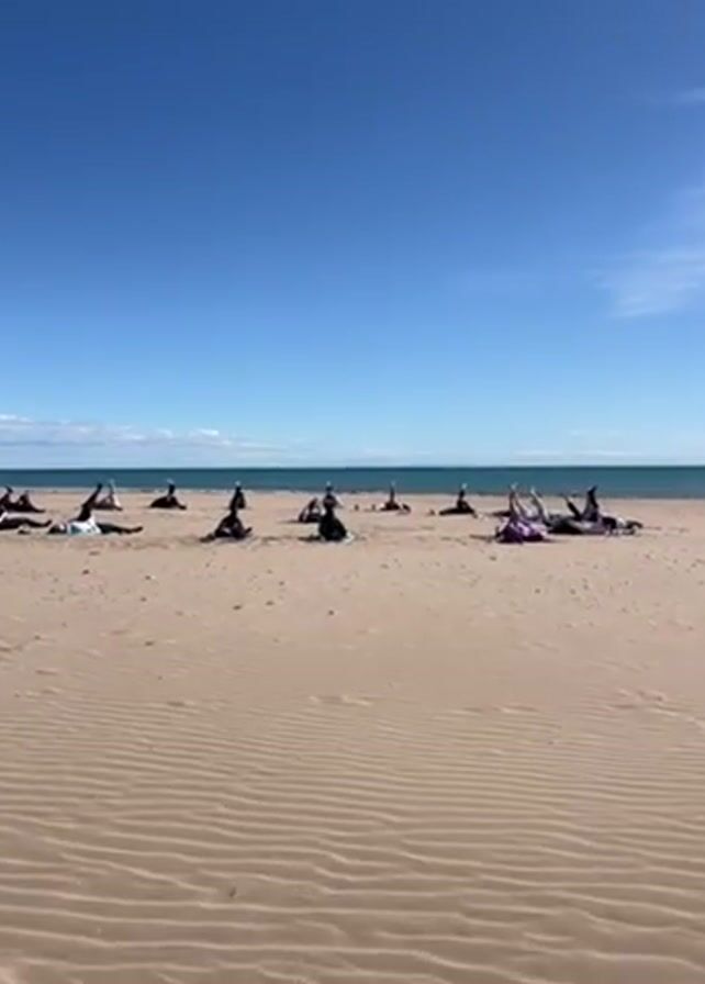 Okay, here's a concise description of the video: The video shows a group of approximately 15 people performing a yoga pose on a sandy beach. The people are lying on their backs with their legs raised vertically in the air. The scene is set on a sunny day with a clear blue sky and a calm ocean visible in the background. The sand is dry and has visible ripple patterns. The people are spread out in a loose formation on the beach.