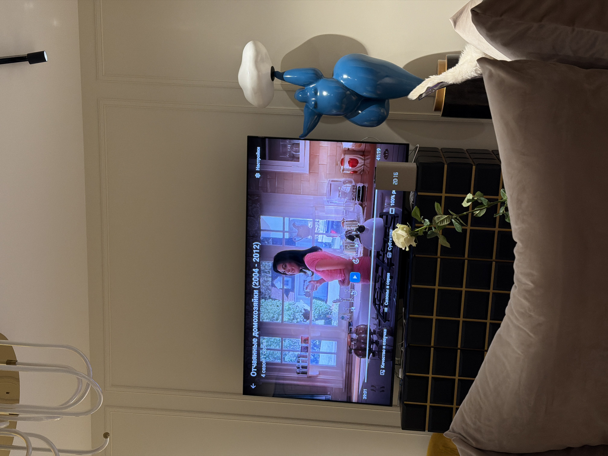 The scene depicts an interior view of a room, possibly a living room or entertainment area, in Unknown, Unknown. A large flat-screen television dominates the center, displaying content from the Russian streaming service Okko. The show "Отчаянные домохозяйки" (Desperate Housewives) from 2004-2012 is playing, specifically "4 сезон 1 серия." On-screen, a woman in a pink top stands in a kitchen, holding a clear glass. Interface elements showing playback time (39:01, 41:19), audio/quality settings, season/episode navigation, and subtitles are visible. The television rests on a black console table featuring a textured surface with a grid of raised squares outlined in gold. To the right of the console, a light-colored rectangular smart speaker or clock displays "20:16" and "100% p." Directly in front of the television, on the console, are several small, dark, possibly ceramic, decorative items. To the right of the television and console, a tall, glossy blue sculpture of a stylized, curvaceous human figure holds a white, illuminated cloud-shaped object above its head, serving as a lamp. Further to the right and partially obscured by a foreground cushion, a white, feathery or furry object, resembling the neck and head of a swan, is visible. In the immediate foreground, two large, light brown or taupe-colored upholstered cushions, likely part of a sofa or armchair, partially obscure the lower portion of the scene. A single long-stemmed white rose with green leaves is positioned between these cushions and the television console. The room's walls are light-colored and feature decorative panel molding. Overhead, a modern chandelier with multiple looped glass tubes hangs from the ceiling, alongside a black track light with a single spotlight.