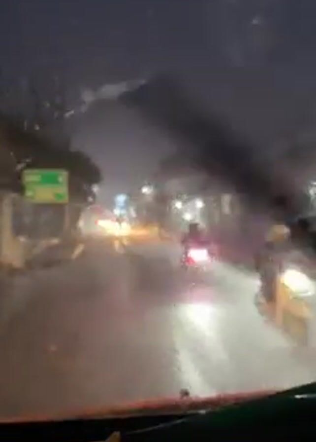 A car is driving down a wet street at night. Raindrops are on the windshield, and the windshield wipers are on. Streetlights and car headlights are visible through the rain. Trees line the side of the road.