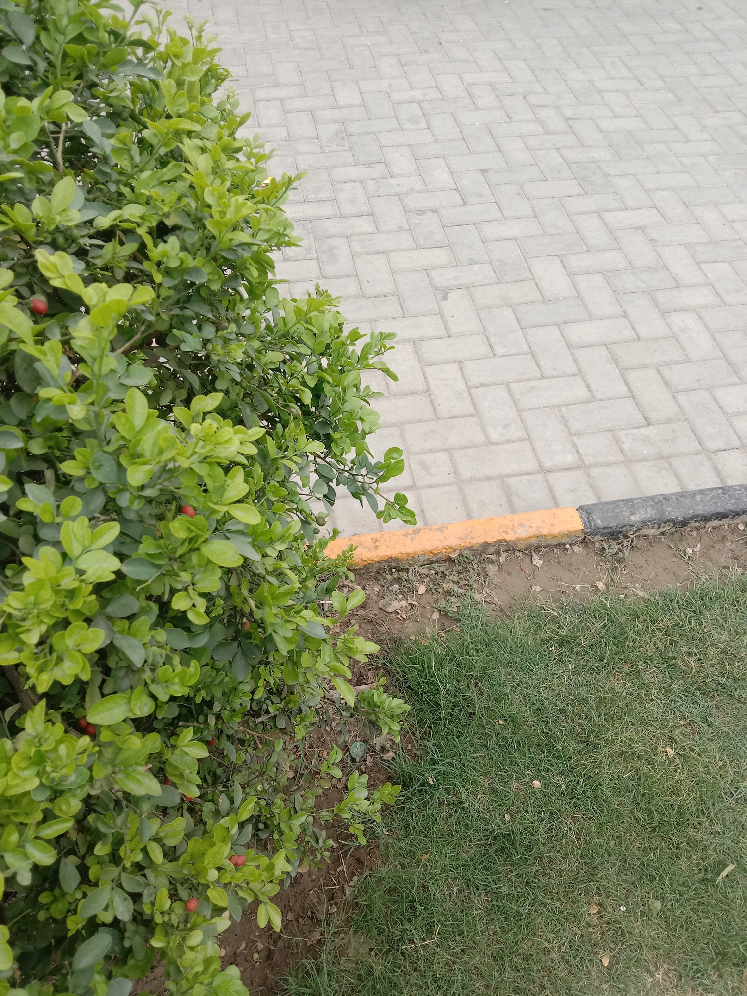 The image depicts an outdoor scene in Kot Bhattian, Pakistan. The upper right portion of the frame features a light gray paved surface constructed from rectangular interlocking pavers arranged in a herringbone pattern. A low concrete curb separates this paved area from a landscaped section. The curb is painted in two distinct segments: a yellow-orange section nearest a dense green bush and a dark gray/black section adjacent to a strip of green grass. The grass strip, approximately one to two feet wide, runs parallel to the curb. To the left and extending into the lower left corner, a thick green bush with numerous small, light green leaves is present. Several small, spherical red berries are visible among the leaves of this bush. The ground directly beneath the bush appears as exposed soil with some scattered dry debris. No individuals or animate subjects are visible within the frame.