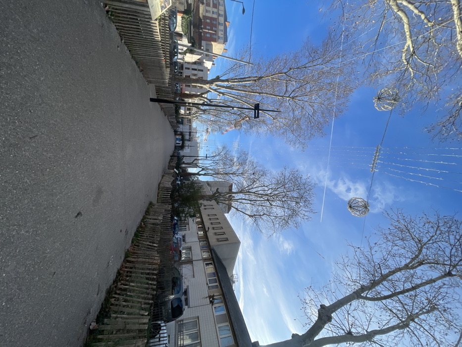 The image depicts a paved pedestrian walkway in Gennevilliers, France, under a clear, bright blue sky with scattered thin white clouds and a prominent aircraft contrail extending horizontally. The time of day is sunny, likely late morning or early afternoon. The walkway, constructed of dark gray asphalt or pavement, extends from the foreground into the distance, narrowing in perspective. It is flanked on both sides by low, rustic wooden fences made of vertical stakes, separating the path from adjacent areas. Overhead, a network of white festive string lights is visible, stretching across the pathway between bare deciduous trees. Two large, spherical, open-frame decorative globes, possibly illuminated, hang from these overhead wires. Numerous leafless trees, characteristic of late autumn or winter, line both sides of the path, with their branches reaching into the sky. On the left side of the path, behind the wooden fence, an elevated section of ground with a retaining wall is visible, followed by a street or parking area with several parked cars. Further back, multi-story urban buildings, including one with a reddish-brown facade, rise above the street level. A dark street light pole stands prominently on the left side of the path. Partially visible in the extreme foreground on the left is a brown interpretive sign or display board. On the right side of the path, beyond the wooden fence, a parking area contains multiple vehicles, including a dark-colored van or SUV. Adjacent to this parking area is a multi-story building with a light-colored facade and numerous rectangular windows, suggesting an administrative or residential structure. Another taller building is visible further down the path on the right. The path recedes towards an opening in the mid-distance, flanked by buildings, suggesting a continuation into another section of the urban environment or a public square. No individuals are present within the frame.