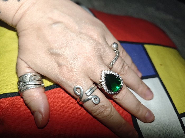 A pale-toned human left hand is positioned centrally, displaying four rings
