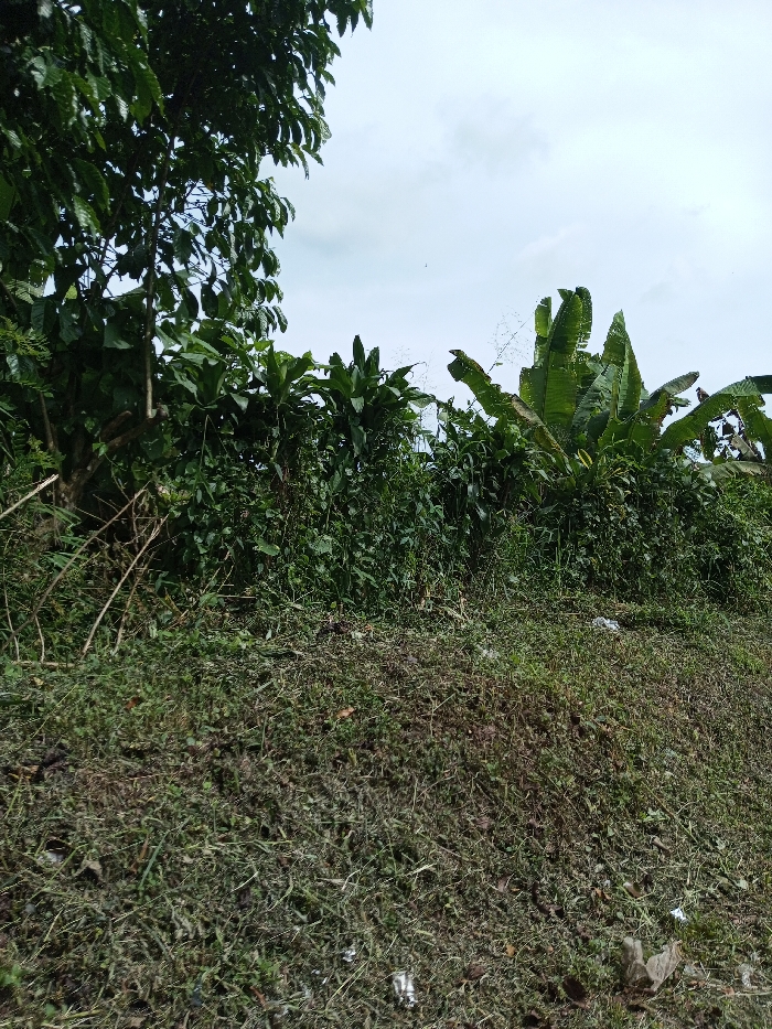 This image depicts a natural outdoor scene located in Kandenuwara, Sri Lanka, under a light grey, overcast sky. The foreground consists of a gently sloping ground covered with a mix of green and dried cut grass and weeds. Scattered refuse, including white plastic fragments and metallic items, is visible on this ground. The midground features a dense barrier of varied green tropical vegetation. Prominent on the right are several large, broad leaves consistent with a banana plant, while other broad-leafed plants and intertwining vines comprise the bulk of the foliage. A portion of a taller tree with dense, dark green leaves is visible in the upper left quadrant. The background is an expansive light grey sky with minimal cloud definition, containing a few indistinct dark specks, possibly small birds or insects. No human subjects or discernible animal life, actions, or interactions are present within the frame.