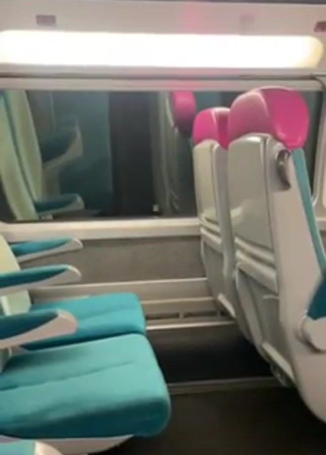 n interior view of a train carriage. Two pairs of seats are visible. The seats have teal-colored cushions and white frames with pink headrests. There's a window to the left, showing a reflection of the seats. The interior is lit by a strip light above. The floor appears to be dark gray or black.