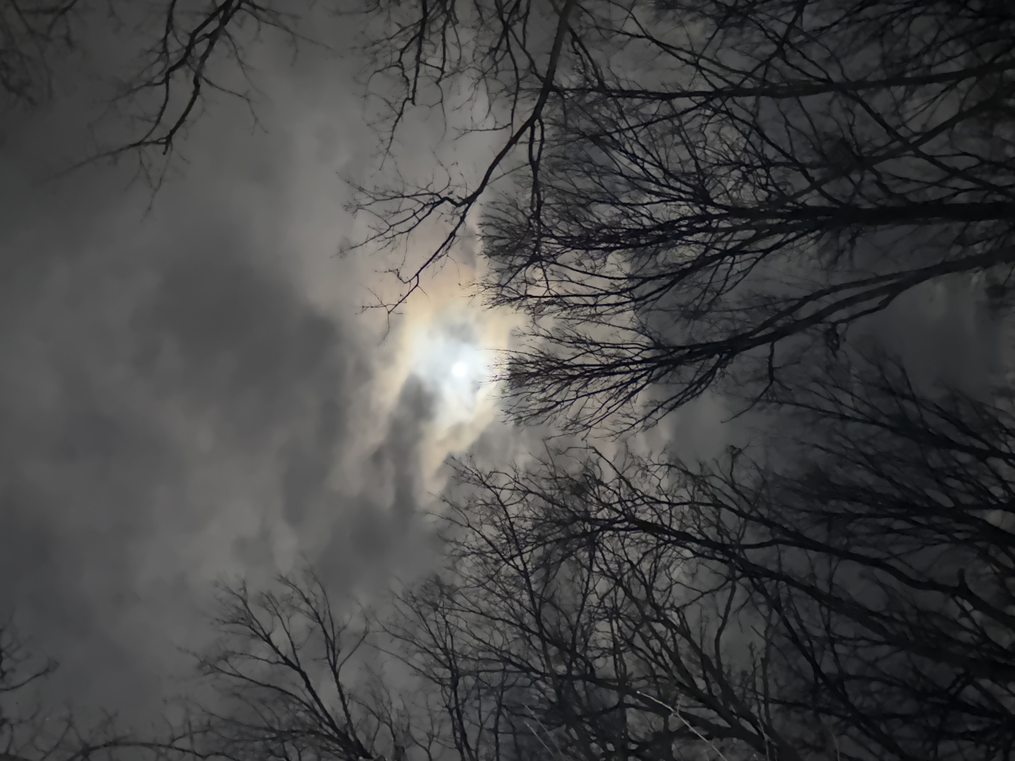 night sky with a bright light source, likely the moon, obscured by clouds