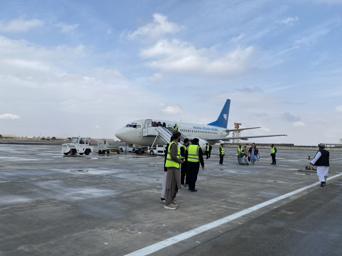 The image captures an active airport tarmac scene in a city of Unknown, Afghanistan, under a partly cloudy sky