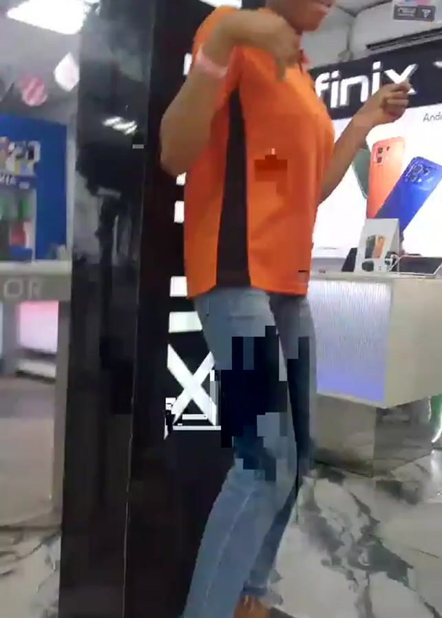 Two women in orange t-shirts, black leggings or jeans, and sandals are standing next to a black Infinix sign in a store that sells phones. One woman is slender with lighter wash jeans and brown sandals. The other woman is heavier, with dark leggings and dark sandals. They hug briefly, and then smile.