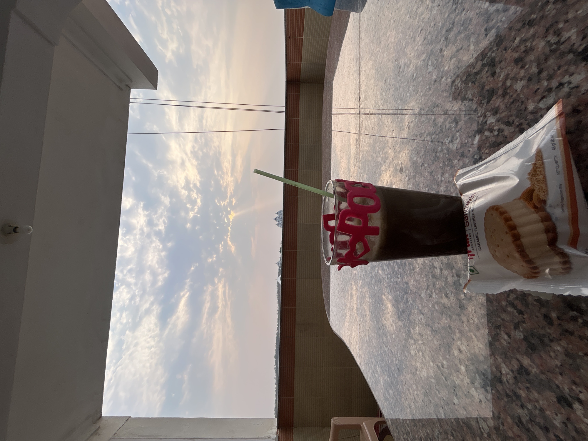 The image displays an outdoor scene on a rooftop or balcony in Puttaparthi, India, overlooking a distant horizon. In the immediate foreground, a dark beverage in a clear glass, adorned with a pink "POP" rubber sleeve and containing a light green straw, rests on a mottled brown and black granite-patterned table. Beside the glass lies a partially unwrapped white plastic package for a "SandWich" brand caramel-flavored ice cream sandwich, revealing a portion of the biscuit and filling; the packaging indicates "NET QUANTITY: 48 g / 60 ml". The table occupies the lower half of the frame. Behind the table, a low wall features a dark reddish-brown tiled top band and a lighter beige tiled lower band. To the far left, a light brown plastic chair is visible. The background reveals a expansive, hazy landscape under a sky filled with scattered clouds, illuminated by soft, golden light from a low sun, suggesting either sunrise or sunset. Several prominent white, domed architectural structures, consistent with the Sri Sathya Sai Super Speciality Hospital or Prasanthi Nilayam complex, are discernible on the distant horizon. An overhead concrete ceiling with a single bare lightbulb is visible, along with multiple thin, dark vertical lines, possibly wires, descending from the ceiling on the right side. No individuals are present in the scene.
