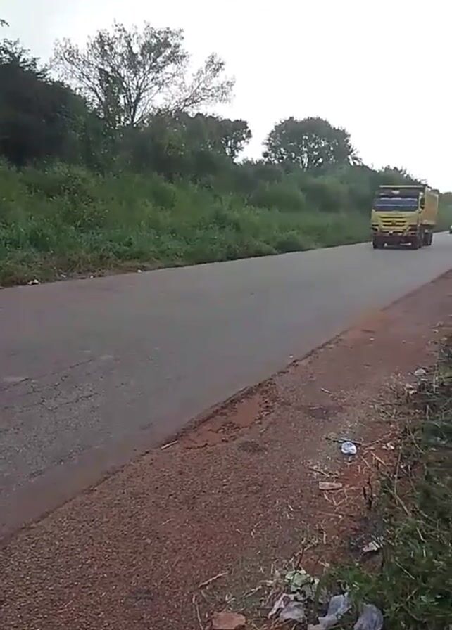yellow dump truck driving on a paved road. The truck is moving from right to left in the frame. The road has some cracks. The sides of the road are lined with green vegetation, including grass and trees. Litter is visible on the side of the road. The sky is overcast. The truck appears to be moderately full.
