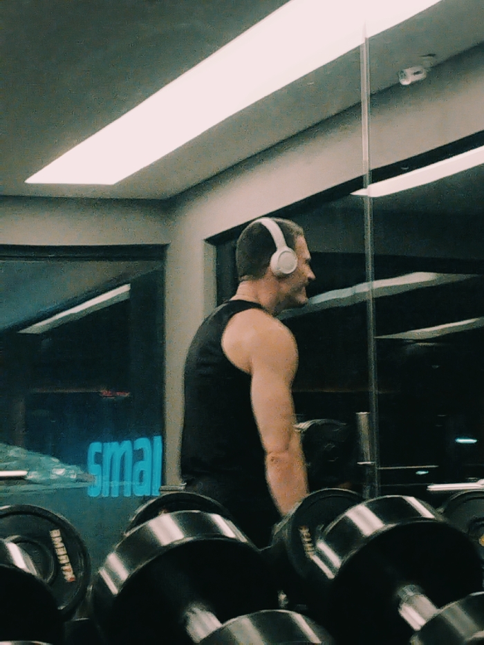 - "A man wearing headphones and a black tank top stands at a weight rack in a gym" by FM-ZqBmD2, licensed under CC BY 4.0