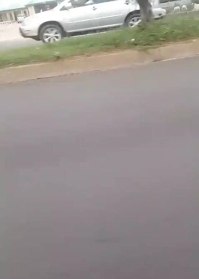view from a moving vehicle on an asphalt road. Initially, a truck and a motorcycle with two people on it are visible in the background. As the vehicle moves forward, a white car passes by on the side of the road. Later, the view shows a fenced area with sheep grazing. Graffiti reading "THIS LAND IS NOT FOR SALE" is visible on the fence. A man can be seen walking in the same direction as the vehicle. The environment is typical of an outdoor area near a road with some vegetation and buildings in the vicinity.