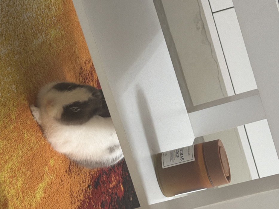 This image depicts an indoor domestic scene in Stara Zagora, Bulgaria. A small domestic rabbit, predominantly white with dark grey-brown markings on its head and back, is positioned on a patterned rug featuring dominant orange and red hues. The rabbit is situated directly beneath a lower white shelf of a furniture unit. On the shelf above, to the right, a cylindrical brown jar with a matching lid is present. The jar features a white label clearly displaying "CHRISTMAS COOKIE" and "FRESHENER," with "100G" partially visible. The background behind the furniture consists of a light-colored wall or tiled surface with visible horizontal dark lines and a horizontal crack. No human subjects are visible. The rabbit is in a stationary, seated posture.