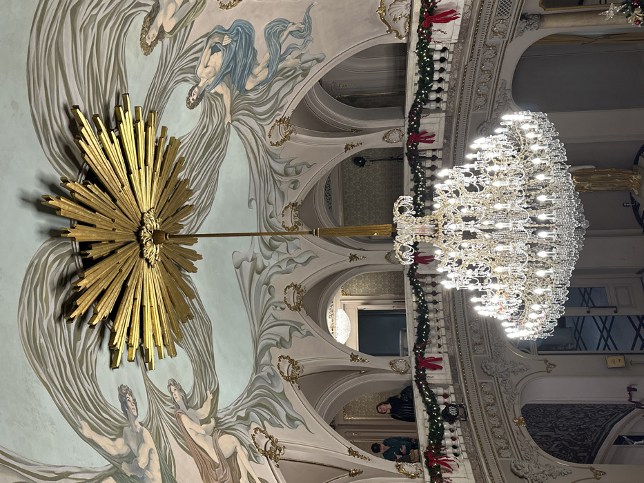 n ornate interior with a painted ceiling depicting figures in flowing robes. A large, golden sunburst decoration is prominently featured on the ceiling. A multi-tiered crystal chandelier hangs from the ceiling, reflecting light. A balcony with Christmas garland and red ribbons is visible. People stand on the balcony. The architectural style is grand and detailed with arched openings.