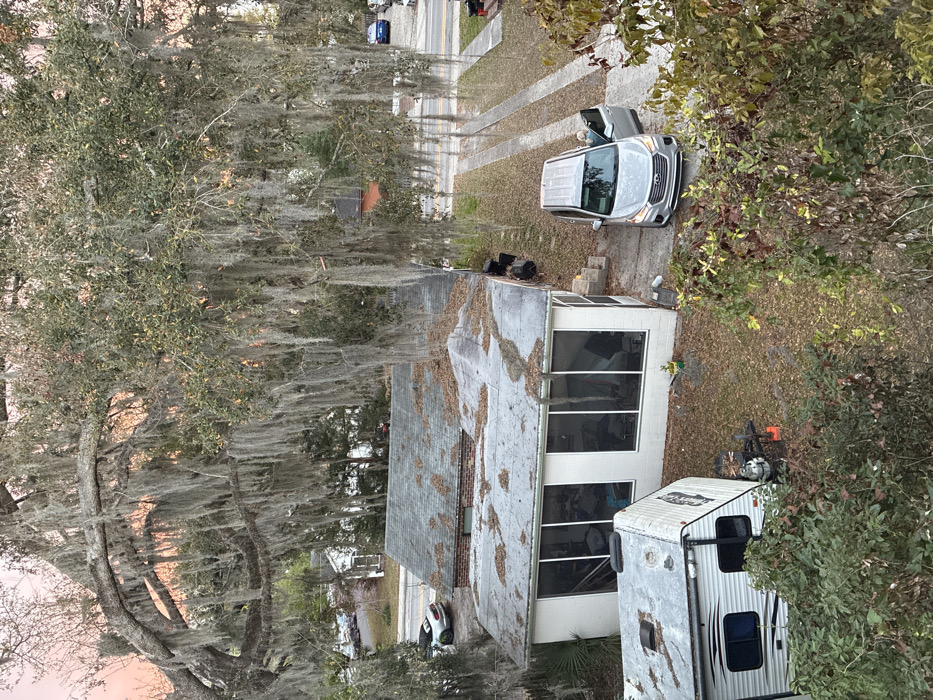 An elevated, overhead view depicts a residential property and street scene in Gainesville, United States of America, under soft, diffused lighting with a faint orange hue on the distant horizon, indicative of sunrise or sunset. The upper portion and foreground are dominated by a large, mature tree heavily draped with Spanish moss (Tillandsia usneoides) and exhibiting green foliage. Below the tree, a single-story house is visible. The main section of the dwelling features a dark, shingled roof substantially covered in fallen leaves. An attached white sunroom or screened porch extension, equipped with large windows/screens, has a flatter, lighter-colored roof also bearing scattered leaves. To the left of the sunroom, a white travel trailer or recreational vehicle (RV) with a weathered roof and a propane tank on its hitch is parked on the ground. A silver minivan or large SUV is parked on a paved driveway to the right of the sunroom. Its front passenger door is open. A single individual, characterized by light-colored hair and wearing a light-colored top, is partially visible near the open passenger door, in the process of exiting or standing adjacent to the vehicle. The ground surrounding the structures consists of sparse dry grass, bare soil, and fallen leaves. In the background, a paved street runs horizontally. A white convertible sports car with green-accented wheels is parked on the street to the left, positioned behind the main house. Further to the right on the street, a blue sedan is parked. Additional residential structures and trees are discernible lining the street in the distance.