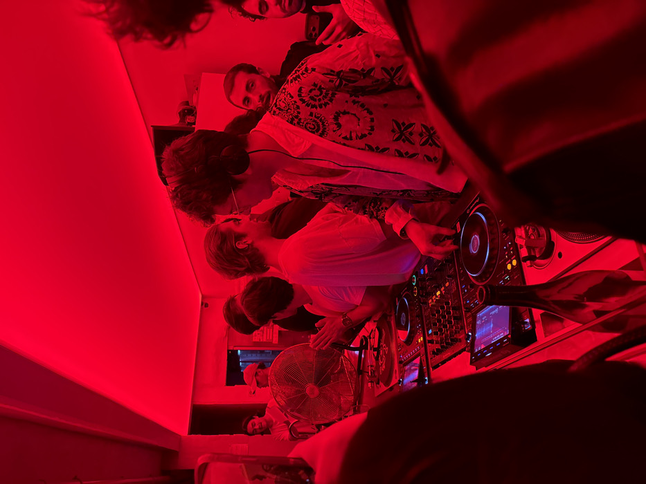 A DJ booth bathed in red light features a group of people. Two individuals operate the DJ equipment, while others look on. One person wears headphones and another a white shirt, focused on the controls. A fan blows air nearby. Several faces peer into the frame, adding to the enclosed, intimate atmosphere of the room. The intense red hue dominates the scene, making details slightly obscured.