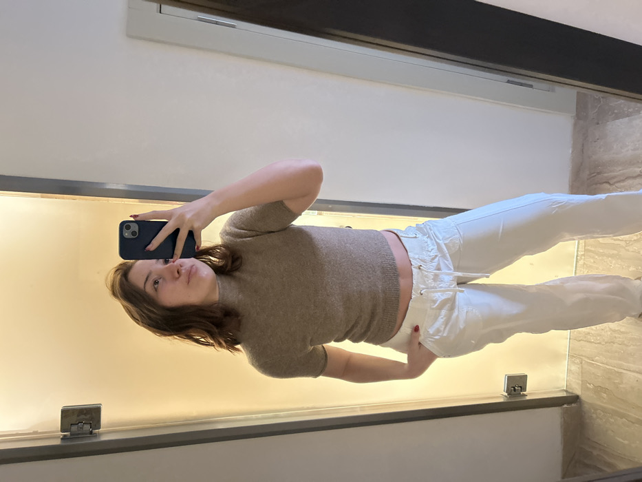 A woman is reflected in a large mirror, capturing a selfie. She wears a tan short-sleeved sweater and shiny white pants with drawstring details at the waist. She is holding a phone in her right hand, its blue case and red nail polish visible. The mirror is framed by a dark border and reflects a white ceiling with a rectangular light fixture. The bathroom features beige marble tiles and silver hardware.
