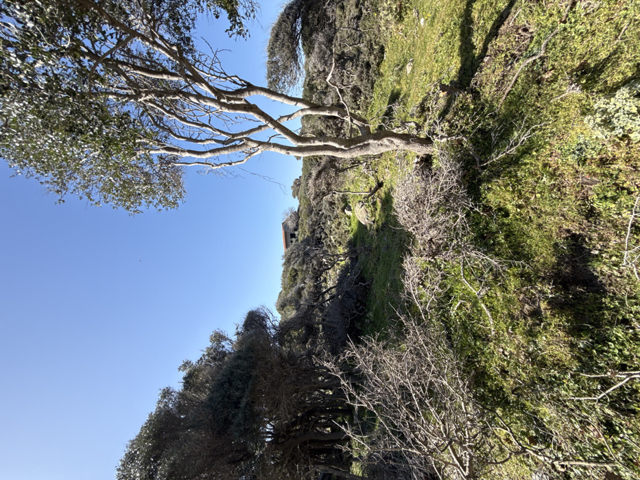 The scene is an outdoor, natural landscape located in Kamariotissa, Greece, under a clear, cloudless blue sky. The terrain is hilly and slopes upward from the foreground to the background. The foreground consists of sparse green grass and ground cover mixed with numerous dry, bare, thorny branches and woody debris, indicating natural vegetation or recent clearing. In the midground, a prominent tree with multiple light-colored, slender trunks and some green foliage stands to the right. To the left, a denser cluster of dark-trunked trees and shrubs with sparse, dark green leaves forms a treeline. The ground continues to rise, covered in green vegetation, low shrubs, and several visible rocks. In the background, positioned on the crest of the hill, a small, light-colored building with a reddish-brown tiled roof is visible. The structure appears rustic or abandoned. The scene is brightly illuminated by direct sunlight, casting distinct shadows to the lower and left portions of the image, consistent with a sunny day. No individuals, animals, or vehicles are present. No specific actions or interactions are depicted.