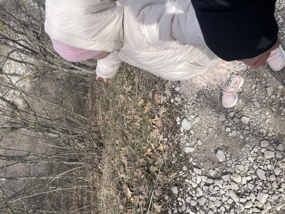 A young child, observed from the back and right side, stands on a light-colored gravel path in a natural, wooded environment identified as Targovishte, Bulgaria