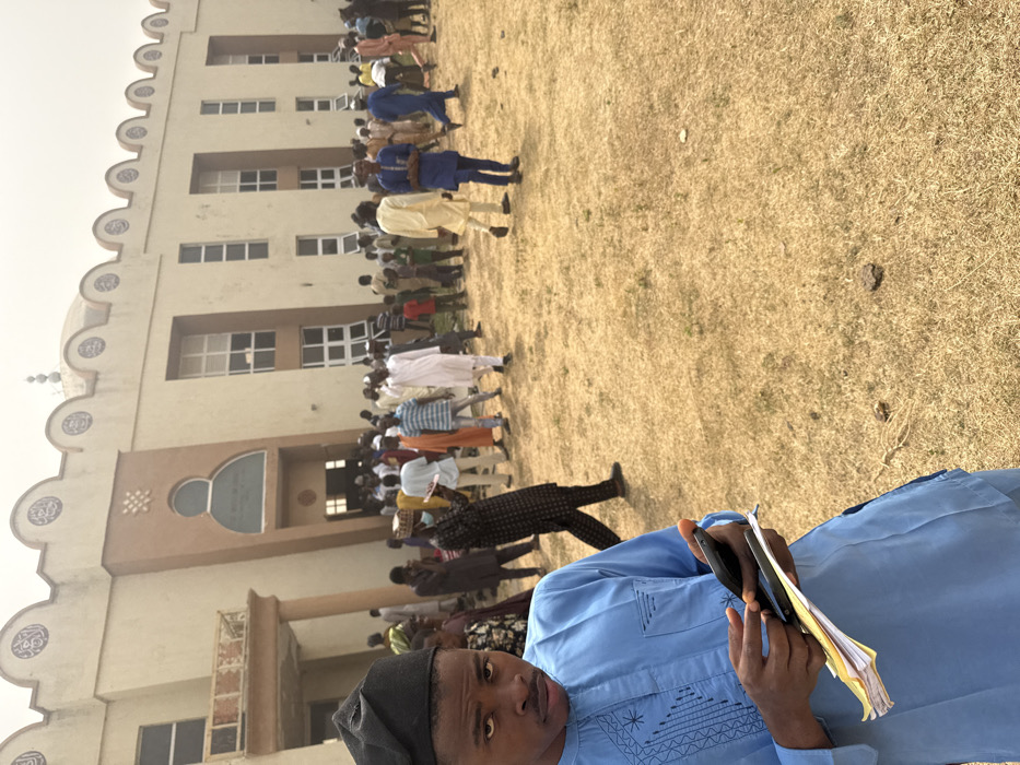 An outdoor scene in Baganakwo, Nigeria, depicts a large gathering of individuals in front of a multi-story, light-colored building. The building features a central recessed entrance with brown trim, numerous rectangular windows, and a decorative roofline with scalloped elements and what appear to be Arabic calligraphic inscriptions. Small, decorative finials are visible on the rooftop. To the left, a structure resembling a covered balcony or portico extends from the building. In the immediate foreground, a male subject, mid-shot, is positioned slightly off-center to the left. He is wearing a light blue traditional long-sleeved garment with embroidered patterns and a dark blue or black cap. He holds a dark-colored smartphone in his right hand and a stack of papers or a notebook beneath it with both hands. His gaze is directed towards the camera. Behind this individual, a large crowd of approximately 50 to 70 people, predominantly male, occupies the midground. They are dressed in a variety of traditional Nigerian attire, including long robes (kaftans or agbadas) and caps, in colors such as white, cream, light blue, orange, and dark patterns. One individual in the midground wears a light-colored face mask. The crowd appears to be congregating and moving in various directions, with some individuals standing in what might be an informal line formation towards the building's entrance. Several children are also visible within the crowd. The ground surface is covered in dry, yellowish-brown grass or dirt, indicating an arid or dry season environment. The lighting suggests an overcast sky or diffused sunlight.