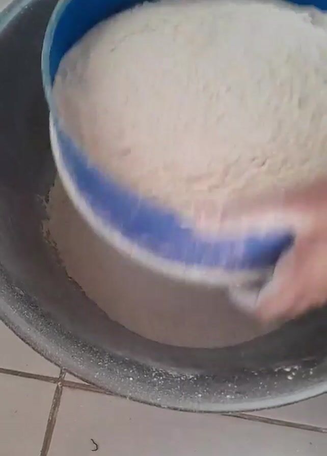 In a close-up, a hand is shown sifting white flour with a blue plastic sieve over a gray plastic tub. The sieve is almost full of flour. The tub appears to have some flour already in it. The background includes cream-colored floor tiles.