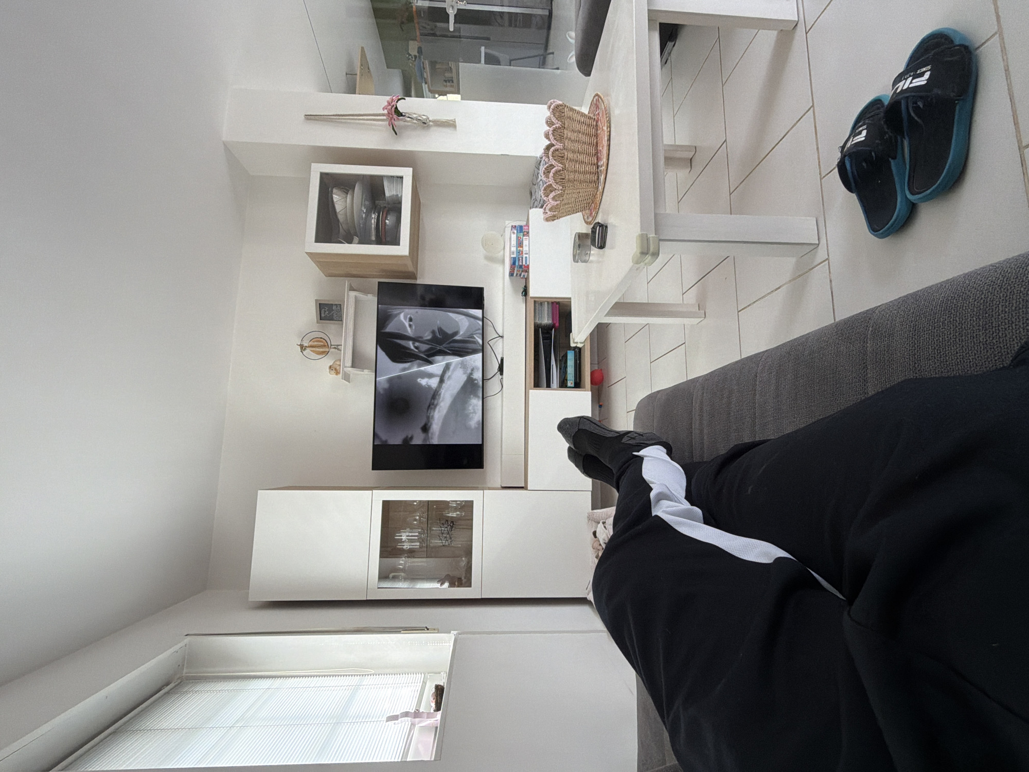 The scene is an interior living space, reportedly located in Trassem, Germany. A person is lying on a grey fabric sofa in the foreground, with their legs extended forward. They are wearing black sweatpants with a white vertical stripe on the outer thigh and dark grey socks. Their upper body is not visible. In the midground, a white rectangular coffee table with light-colored corner protectors is positioned on a light-tiled floor. On the table, a wicker basket with pink scalloped edges rests on a patterned mat, alongside a small cylindrical silver container and a dark rectangular object. To the right of the coffee table, on the floor, a pair of black and teal Fila slides are present. Against the far wall, a white entertainment unit comprises several modules. A television is centrally mounted, displaying a black and white image, possibly a stylized face or character. Below the television, open shelves contain various items, including books or media cases. To the left of the television unit, a tall white cabinet with a glass-fronted upper section displays glassware. Above and to the right of the television, a wall-mounted wooden-framed cabinet with glass doors contains dishes. A small white floating shelf above the television holds a globe ornament and a framed picture. To the left, a window with white horizontal blinds is visible, allowing diffused light into the room. A pink object and other small items rest on the windowsill. To the right, a white structural column or wall partition features a macrame plant hanger holding pink artificial flowers. Beyond this partition, glimpses of another room, possibly a kitchen or dining area with light-colored cabinetry, are visible. The walls throughout the visible space are white, and the floor is covered with large, light-colored square tiles.