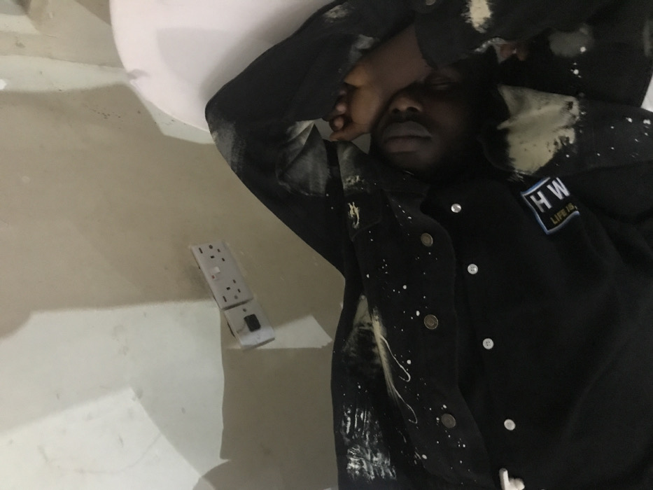 A man in a black jacket lies on the floor, his head resting near a white sink and his arm covering his eyes. The jacket features white splatters and a patch that reads "HW LIFE IS..." in blue and white. A double electrical outlet is visible on the wall near the floor. The room appears unfinished or under construction, with bare walls and exposed electrical components. The overall impression is one of exhaustion or discomfort.