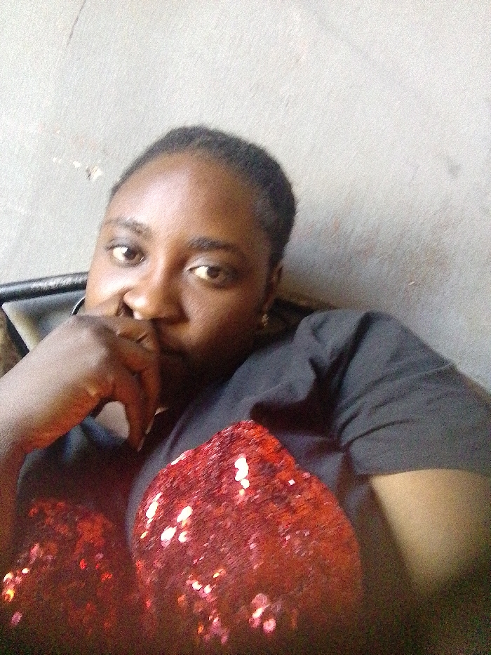 A dark-skinned adult female is depicted in a close-up, chest-up shot, looking directly into the camera. She has short, dark hair and brown eyes. Her right hand is raised, with fingers partially obscuring her mouth and chin. She is wearing a dark, short-sleeved top featuring a large, irregular patch of red sequins across the chest. A light-colored earring is visible in her left ear. The background consists of a plain, light grey wall with minor textural variations. A dark object, possibly furniture, is partially visible behind her upper left side. The scene is located indoors, within the city of Jos, Nigeria.