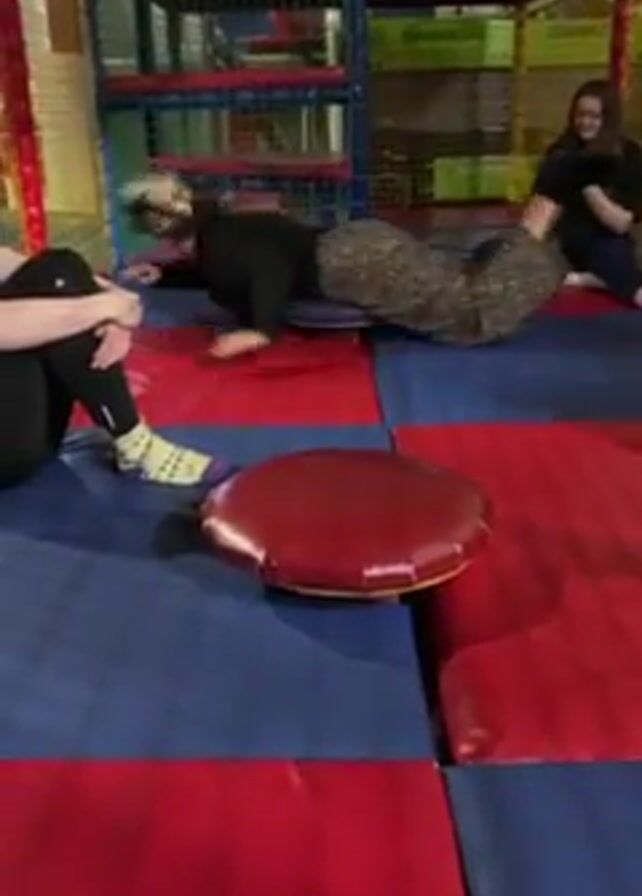 In a play area with a red and blue padded floor, three women are visible. One woman is sitting with her legs crossed and a phone in her hands. Another woman in black leggings and socks sits with her legs bent and arms around them. A third woman is on the floor, attempting to climb onto a red, circular platform with a yellow border. She first puts her hands and knees on the platform, then slips and crawls forward. Eventually, she successfully gets on the platform and then falls backwards, landing on her back with her legs in the air. The woman on the floor laughs as she watches the woman struggling with the platform. A play structure with multiple levels is visible in the background.