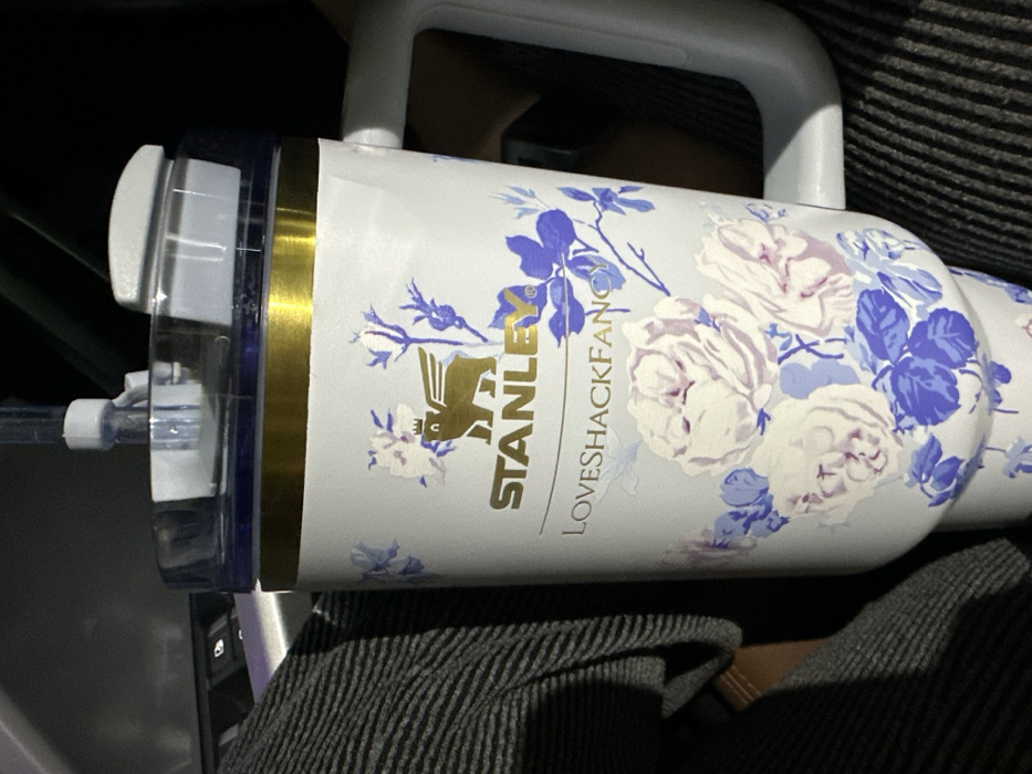 - "A white Stanley LoveShackFancy tumbler stands upright, adorned with light pink and blue floral patterns and a gold band near its transparent plastic lid" by FM-Z1DMO2, licensed under CC BY 4.0