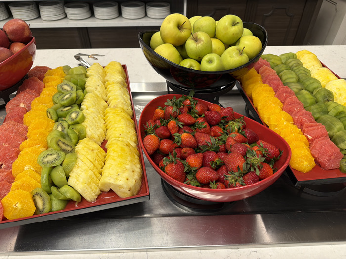 The image displays a buffet-style fruit arrangement within an indoor setting in the city of Kazanlak, Bulgaria. No individuals are present. The scene features multiple containers of fresh fruit on a light-colored countertop over a metallic buffet line surface. On the far left, a red bowl contains whole red apples. Adjacent to it, a red rectangular tray presents neatly arranged rows of sliced fruit: pink grapefruit, orange, kiwi, and pineapple, from left to right. In the center, an elevated black bowl holds numerous whole green-yellow apples. To its right, a large red oval bowl is filled with whole red strawberries, many retaining their green calyxes. Another red rectangular tray is partially visible on the far right, displaying similar rows of sliced fruit, including pineapple, kiwi, orange, and pink grapefruit. The background shows dark wooden cabinetry with multiple stacks of white ceramic plates on an upper shelf. The overall environment suggests a food service area, such as a hotel breakfast buffet.