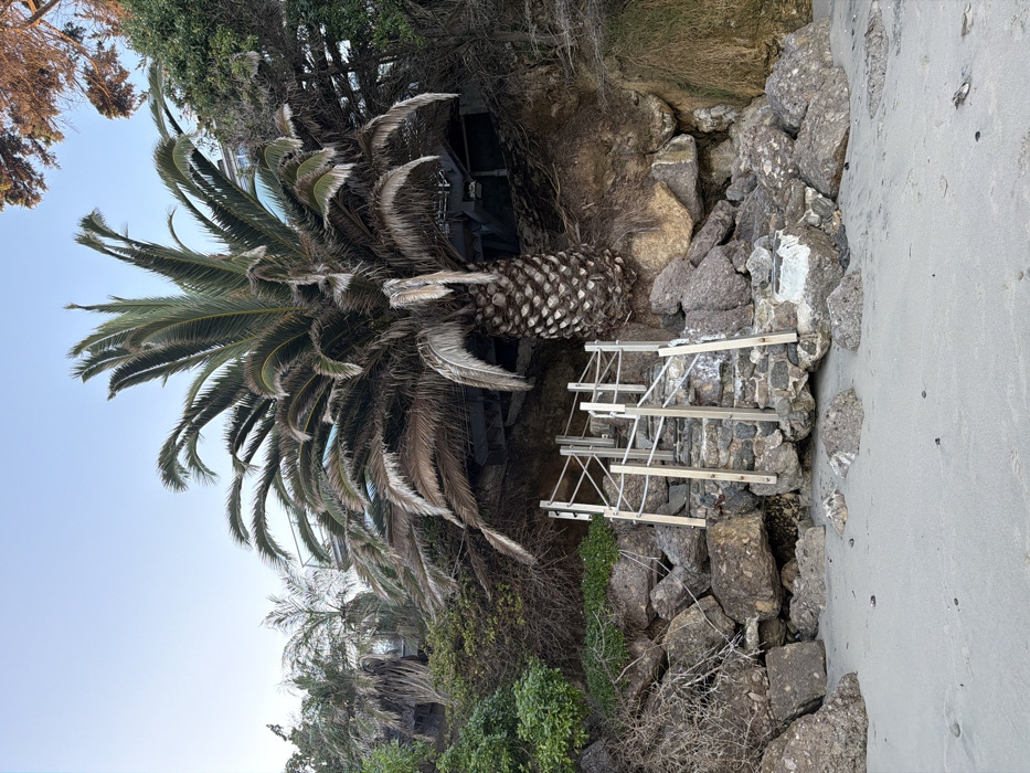 A palm tree dominates the view, its fronds arching downwards. A rock wall sits adjacent, leading to a set of metallic steps leading up the wall. Sparse greenery is visible behind the tree and along the base of the wall. A concrete walkway runs along the right edge, and the sky is a gradient of blue.
