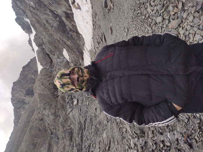 A person, wearing a camouflage balaclava and a black puffer jacket with white stripes on the sleeves, stands on a rocky, gravel-covered slope. Behind them is a steep, rocky mountain face with patches of snow clinging to its surface. The sky overhead appears overcast, suggesting a cold and possibly challenging environment. The individual's attire implies they are prepared for cooler conditions, possibly engaging in mountaineering or hiking activities.