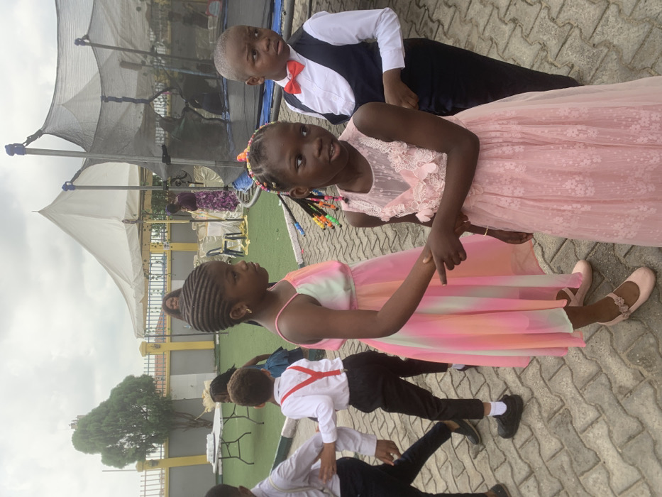 group of children standing on a paved area outside a building in Lagos, Nigeria, located at coordinates 6.571 latitude and 3.391 longitude. There are three girls and two boys. One girl is wearing a pink and orange dress, another is wearing a pink dress with lace detailing, and the third is wearing a blue dress. The two boys are wearing white shirts, black pants, and bow ties. One boy is wearing a red bow tie and the other is wearing a black one. The children are all looking at the camera. In the background, a large white canopy tent and a trampoline are visible. There is also a white fence with a green lawn behind the children. The ground is made of a patterned red brick.