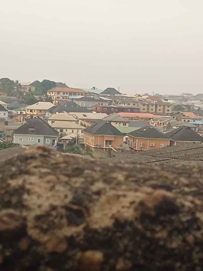 A cityscape of assorted houses fills the frame, roofs a mix of dark and light tones. Buildings cluster together on a slight incline, receding into the distance under an overcast sky. The foreground is dominated by a textured, stony surface, blurring the lower portion of the scene. Overall, a hazy, muted color palette prevails, lending a somewhat obscured view of the urban landscape.