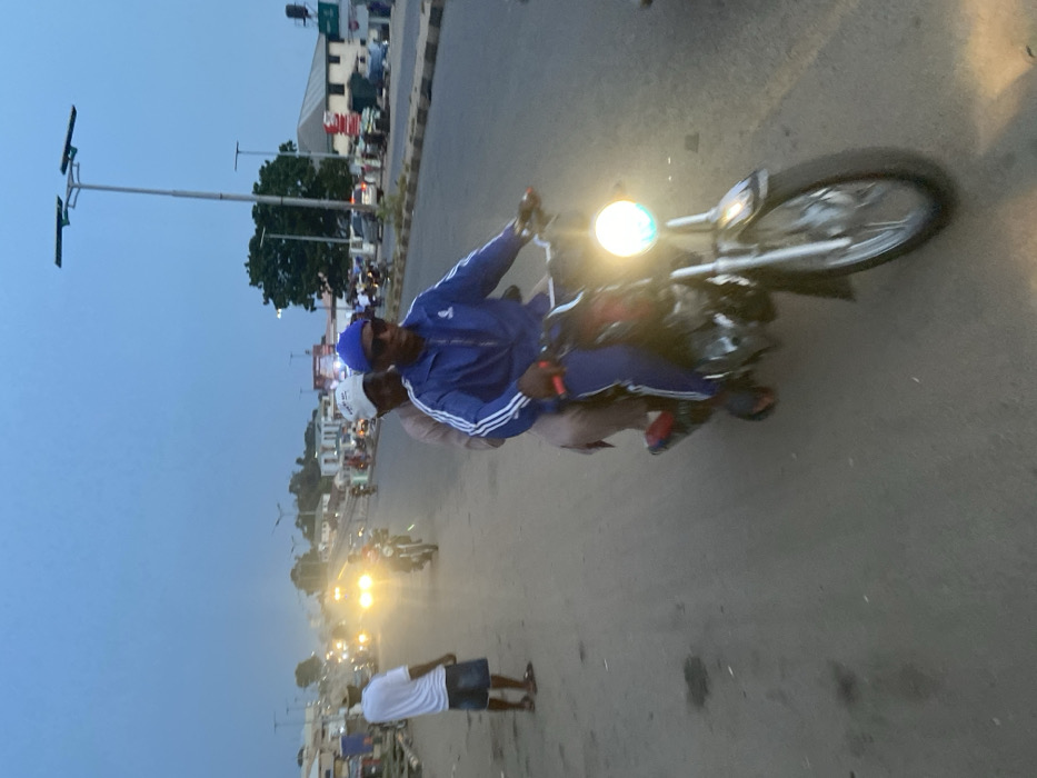 The image depicts a street scene in Lokoja, Nigeria, during dusk or early evening